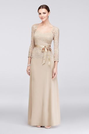 The pretty sweetheart neckline of this glitter lace and chiffon mother of the bride dress creates a flattering frame for the face. Other special details include a scalloped peplum flounce and soft satin ribbon sash.
