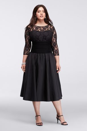This long sleeve dress is seriously chic. The illusion lace sweetheart neckline and sleeves are made all the more lovely thanks to the ruched midsection and a full taffeta skirt.