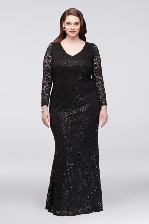 A keyhole back provides cool contrast to the covered-up look of this long-sleeved, sequined lace plus-size sheath gown. And don't worry about showing off more than you want to: the cutout is perfectly bra-friendly.