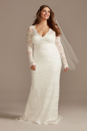 This boho lace wedding dress gets romantic touches from scallops along the plunging neckline, tassel-tied back, and hem. The sheath silhouette is form-fitting and flattering, and the sheer long sleeves provide just the right amount of coverage.