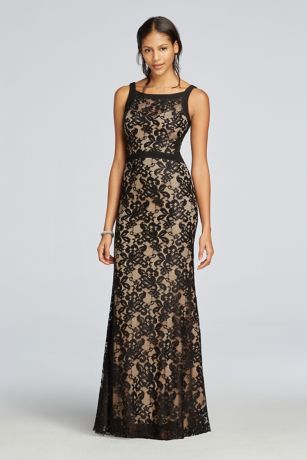 - Long illusion all-over black lace with nude lining dress features sweetheart neckline, tank straps and a fit and flare skirt.