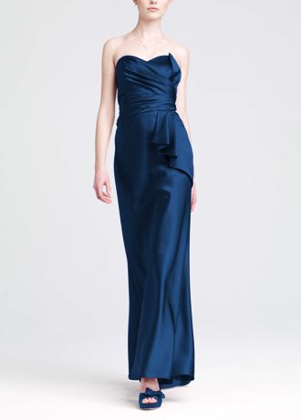 - Strapless satin dress with side peplum and trumpet skirt.