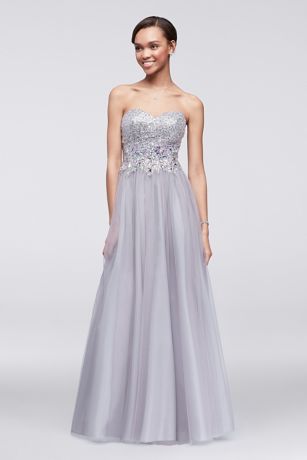The crystal-encrusted sweetheart bodice on this ball gown will make you shine on and off the dance floor. The full skirt and a lace-up corset back are universally flattering.