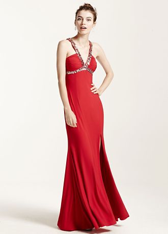 - Sleeveless bodice features sultry plunging v neckline with dazzling sequin trim on the straps and back.