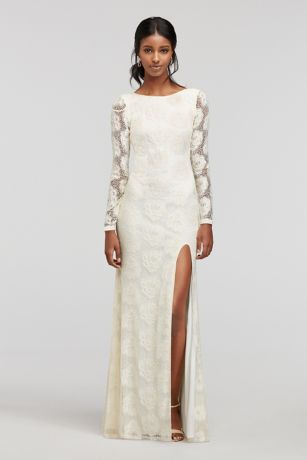 Put your fashion foot forward in this all over lace dress, with long sleeves! All over flower pattern lace creates a delicate look. Floor length skirt features left side slit.