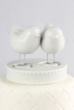 This lovely cake topper set includes two ceramic bird figurines and base. These charming bird figurines feature lightly-sculpted details and silver metal. Larger base features ceramic beading on the edges.