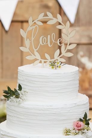 An elegant addition to a rustic wedding reception, this wooden cake topper features the word "love" inside a circle of vines.