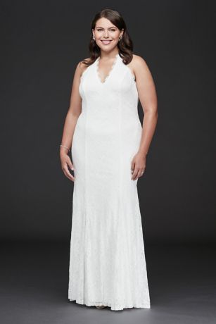 This romantic allover lace halter gown combines beauty and comfort, with figure-flattering princess seams and a touch of stretch for dance-all-night ease. The V-neckline is traced with fluttery eyelash trim, and a deep-dipped back finishes the look.