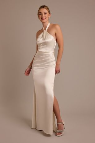 With exquisite details like a tie-back halter, keyhole, and side draping, this luxe charmeuse wedding dress takes clean lines to the next level.