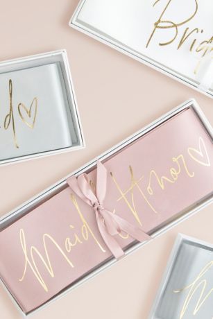 This pretty boxed sash is crafted of double-faced satin and printed with the phrase "maid of honor" in scripted gold font.