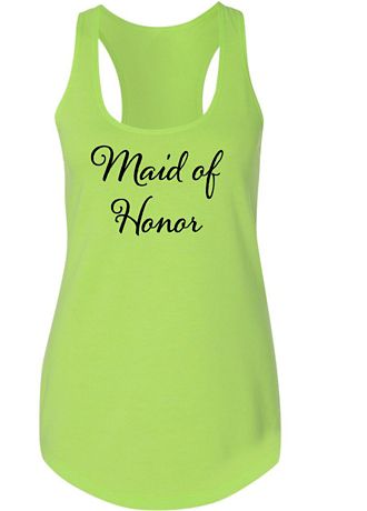 Our sleek flowy racerback tank top features Maid of Honor in a gorgeous script font. This loose-fitting tank is available in dozens of colors and is printed in your choice of white or black.