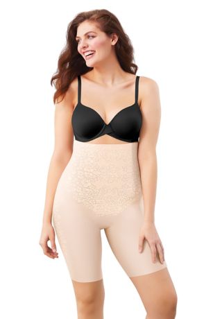 This high-waisted thigh slimmer uses lightweight, targeted control to flatten your stomach, smooth your hips, and lift your rear. The waistband sits just below the bust.