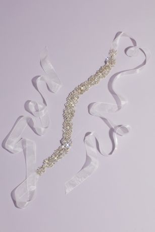 Pear-shaped and marquise-cut crystals form dramatic bursts that adorn this encrusted chiffon sash. The ribbon ties beautifully contrast against the opulent crystal design that sits at the waist.