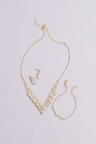 Your quincea era look will be even more regal when topped with this matching jewelry set, featuring a marquise crystal-encrusted necklace, earrings, and bracelet.