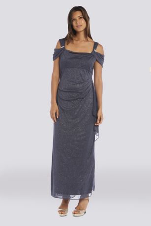 Soft matte chiffon cascades gracefully from the empire waistline, complementing the luxe draping of the cowl neckline and cold-shoulders of this special-occasion gown.
