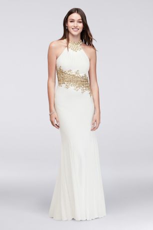 Take a twirl in this matte jersey column dress to show off the intricate, embroidered-lace illusion paneling that accents the back and waistline.
