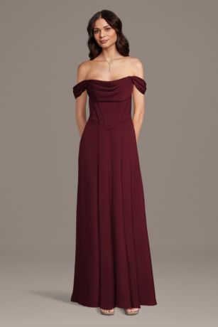 This matte satin dress features an elegant off-the-shoulder neckline and a flattering corset bodice with a basque waist. The glamorous silhouette is perfect for bridesmaids and special events.
