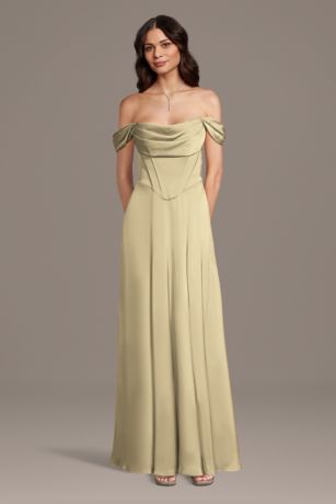 This matte satin dress features an elegant off-the-shoulder neckline and a flattering corset bodice with a basque waist. The glamorous silhouette is perfect for bridesmaids and special events.