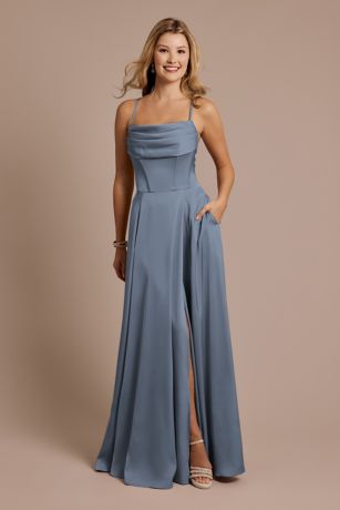 With a sexy cowl neckline and graceful skirt, this matte satin spaghetti strap A-line dress exudes sophistication for bridesmaids or any event.