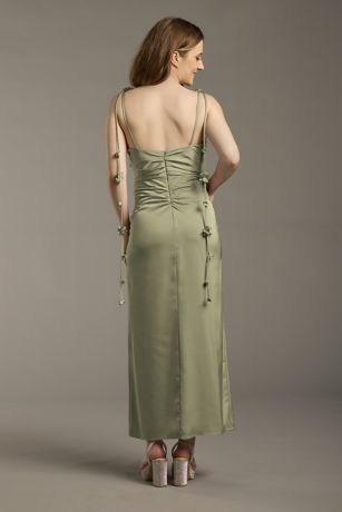 Elegant and romantic, this matte satin midi dress features delicate floral straps that add a whimsical touch. The sleek silhouette and soft sheen make it perfect for bridesmaids or any special occasion.