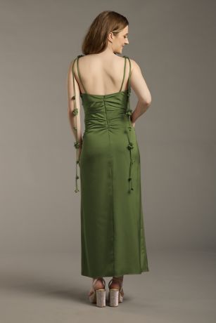 Elegant and romantic, this matte satin midi dress features delicate floral straps that add a whimsical touch. The sleek silhouette and soft sheen make it perfect for bridesmaids or any special occasion.