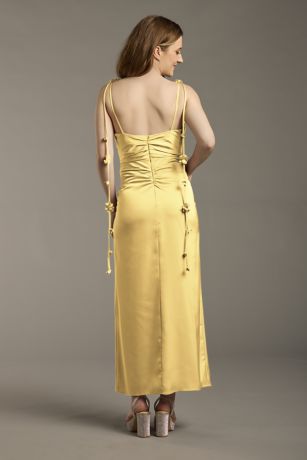 Elegant and romantic, this matte satin midi dress features delicate floral straps that add a whimsical touch. The sleek silhouette and soft sheen make it perfect for bridesmaids or any special occasion.