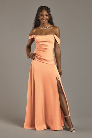 Sleek sophistication defines this matte satin off-the-shoulder drop-waist dress. The fluid silhouette skims the body with understated elegance, while structured bodice boning ensures a secure, flattering fit. An off-shoulder neckline adds a romantic edge, balancing modern structure with timeless appeal. Perfect for weddings and formal evenings, this versatile style transitions effortlessly from ceremony to dance floor.