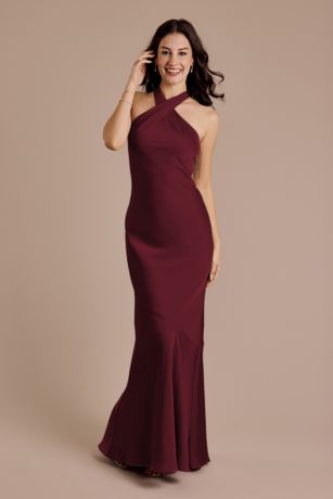 A high Y-neckline adds contemporary flair to this luxurious matte satin sheath dress, which hugs the figure in all the right places with bias-cut fabric. Perfect for bridesmaids and partygoers alike.