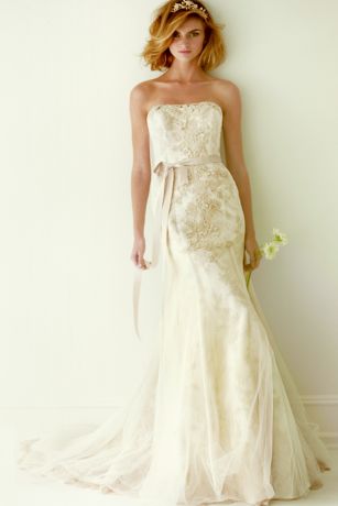 - Strapless soft gown features beautiful and feminine veiled corded lace and tulle neck detailing