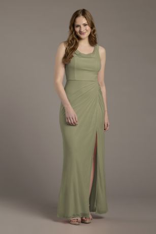 This mesh A-line dress exudes modern charm with its softly draped cowl neckline and figure-flattering ruched bodice. Lightweight and effortlessly stylish, it's perfect for bridesmaids or partygoers ready to dance the night away.