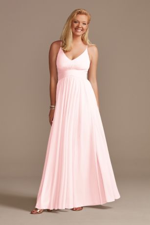 Delicate spaghetti straps and a sleek racerback give this mesh bridesmaid dress a modern feel. A figure-flattering pleated crisscross waistband and a full, soft skirt complete the look.