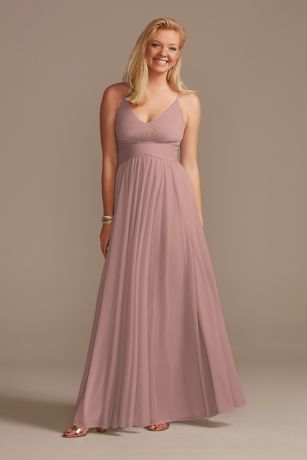 Delicate spaghetti straps and a sleek racerback give this mesh bridesmaid dress a modern feel. A figure-flattering pleated crisscross waistband and a full, soft skirt complete the look.