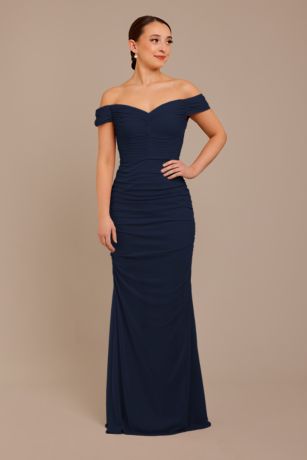 With an off-the-shoulder neckline, swag sleeves, and ruching, this mesh bridesmaid dress oozes glamour.
