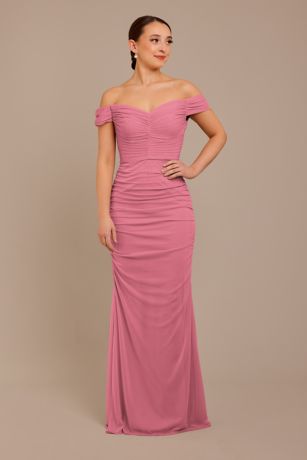 With an off-the-shoulder neckline, swag sleeves, and ruching, this mesh bridesmaid dress oozes glamour.