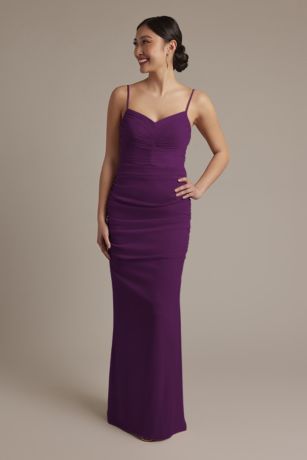 With a sweetheart neckline, spaghetti straps, and ruching, this mesh bridesmaid dress oozes glamour.