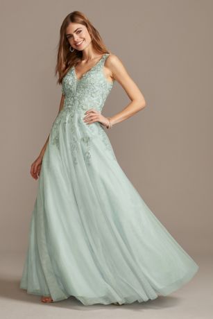 Turn heads in this elegant mesh ball gown, adorned with dimensional floral appliques and detailed with a plunging illusion V-neckline.