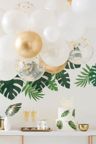 Metallic and white balloons, and faux-eucalyptus foliage come together to create this beautiful balloon arch.