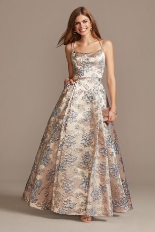 Metallic Brocade Double Spaghetti Strap Ball Gown
