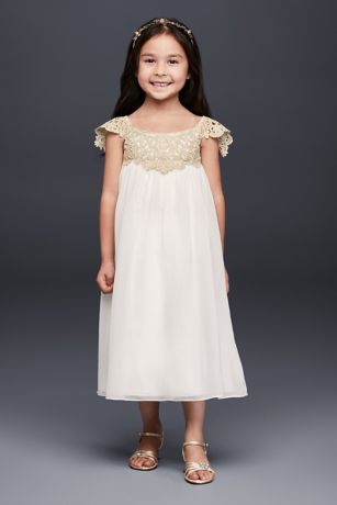 A boho take on the metallic trend, golden crochet forms the flutter sleeves and intricate yoke of this soft chiffon flower girl dress.