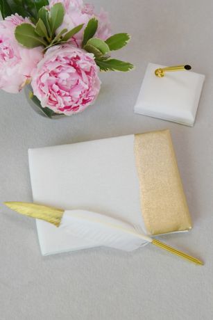 Pair this gold-dipped book and pen with some tea lights and green foliage to create an elegant guest-signing area.