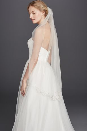 - One tier mid length veil lavishly embellished with Filigree beads in a scroll pattern and a metallic edge.