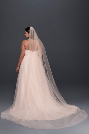 Echo the warm tones of a pink wedding dress with this coordinating, metallic-edged, cathedral veil.