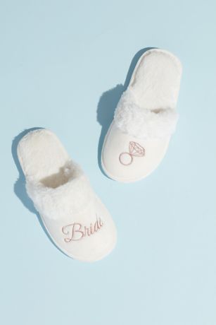 Detailed with a faux-fur cuff, and embroidered with the word "bride" and a diamond ring, these fuzzy slippers are the epitome of comfy-chic.