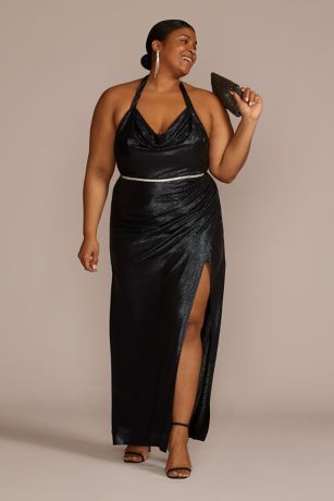 Perfect for formal occasions, this wow-worthy sheath dress is crafted with sleek shining metallic fabic, with a draped halter neckline and ruching at the waist. A dramatic skirt slit adds a sexy detail.