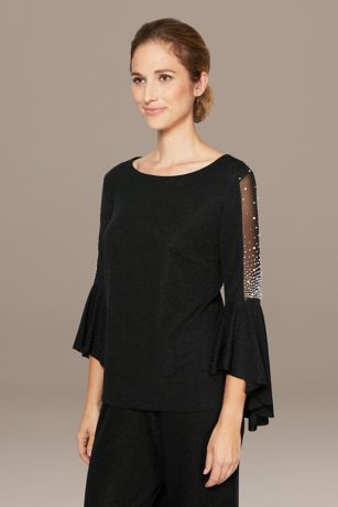A stunning piece for your next big event, this soft and stretchy metallic knit pullover blouse features three-quarter illusion sleeves with a cascading bell flourish.