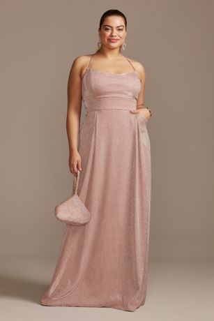 Made from a unique metallic glitter knit, this dress absolutely shines. Delicate spaghetti straps, a lace-up back, and a gently pleated skirt add elegant details.