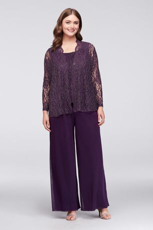 This three-piece, plus-size pantsuit glimmers with a metallic lace shell and sheer matching jacket atop flowing chiffon wide-leg pants.