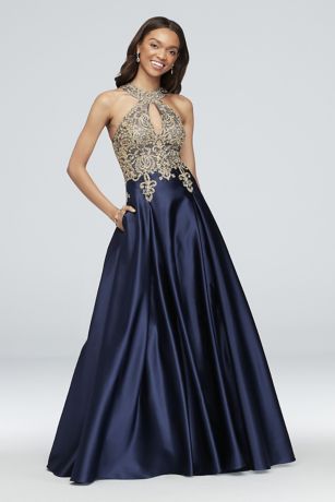 Gold corded lace adds bright shine to the round-neck, keyhole bodice of this satin ball gown.