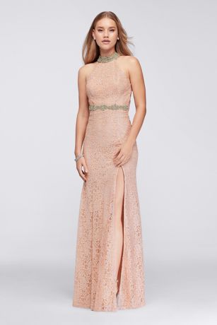 Sparkling crystal beading at the collar and waist makes this metallic lace sheath dress seriously chic.