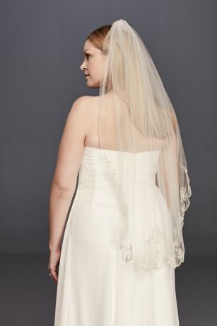 - This metallic mid length veil features exquisitely beaded detail along its scalloped edges.